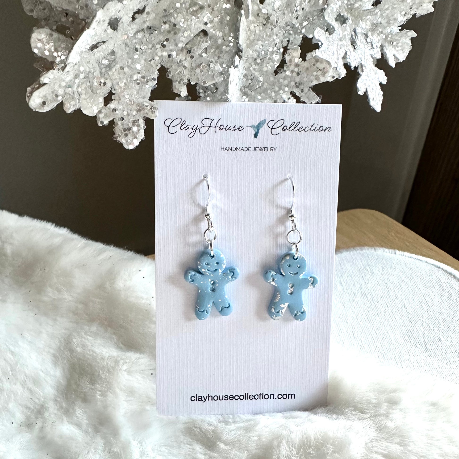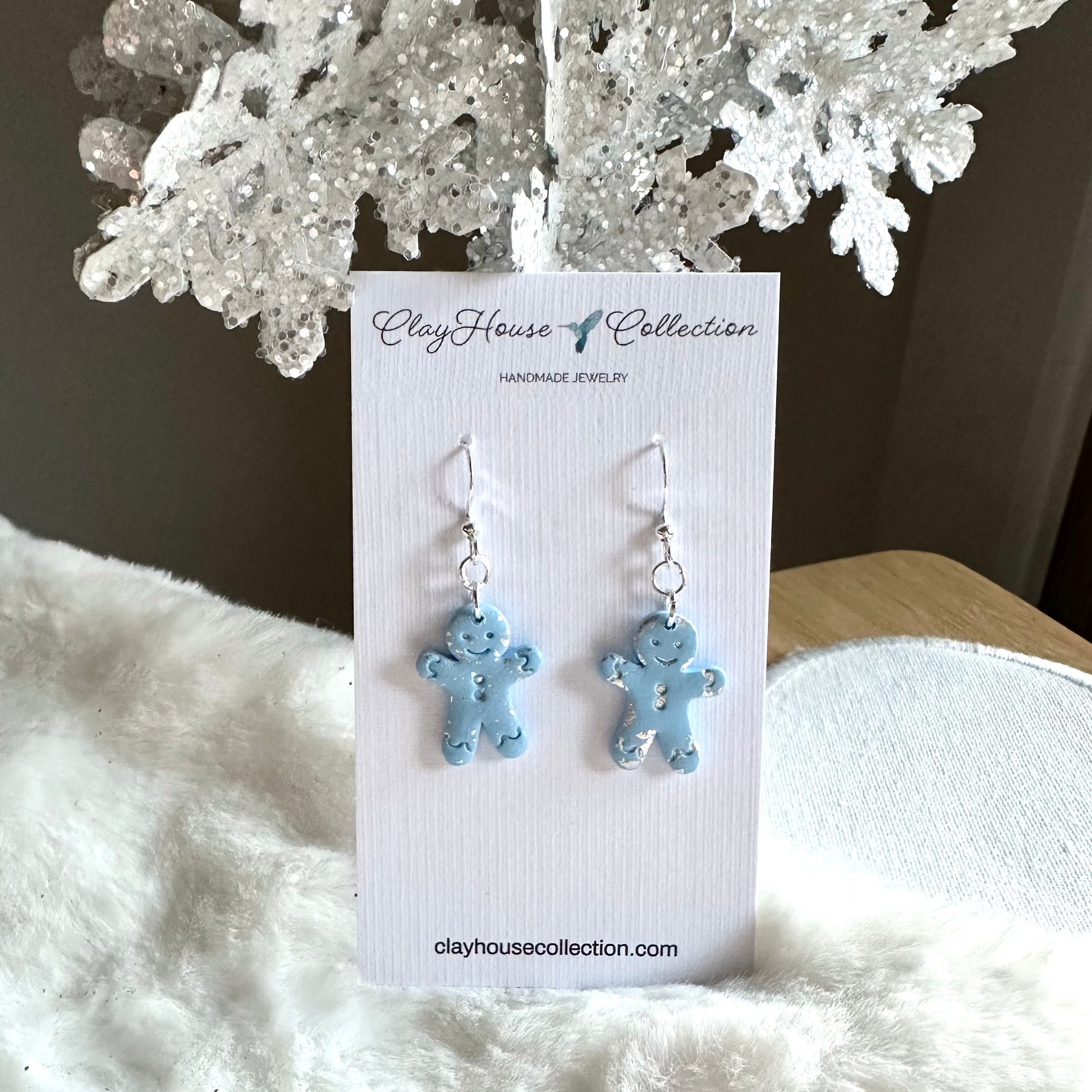 Light blue small gingerbread man earrings with silver leaf foil accent, and 925 sterling silver shepherd’s hook with rubber back.