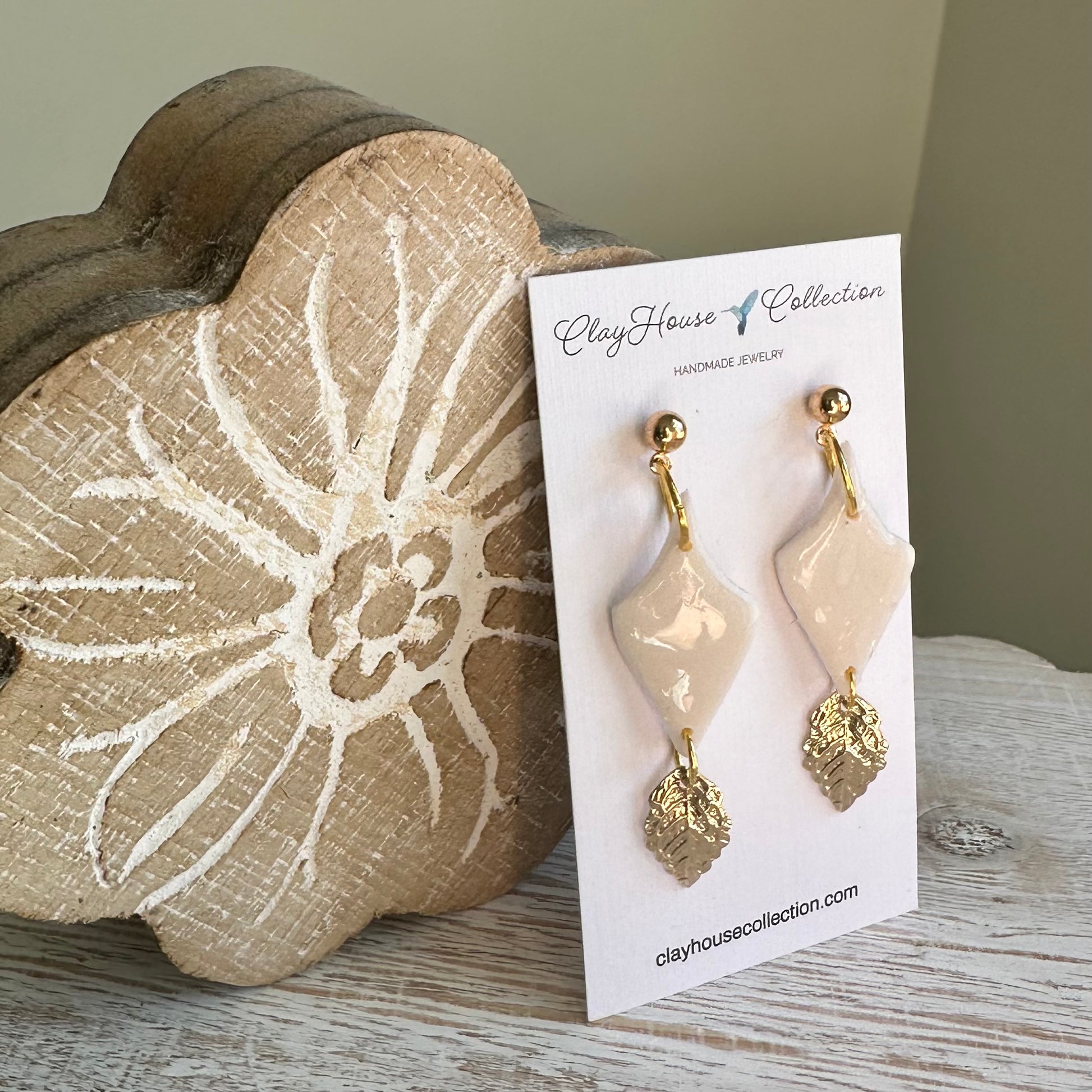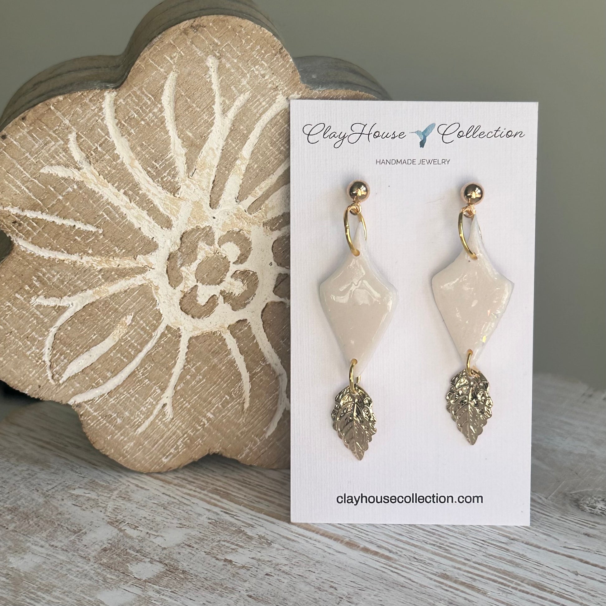 Kite shaped ivory clay dangle earrings with gold ball stud and gold feather accent.