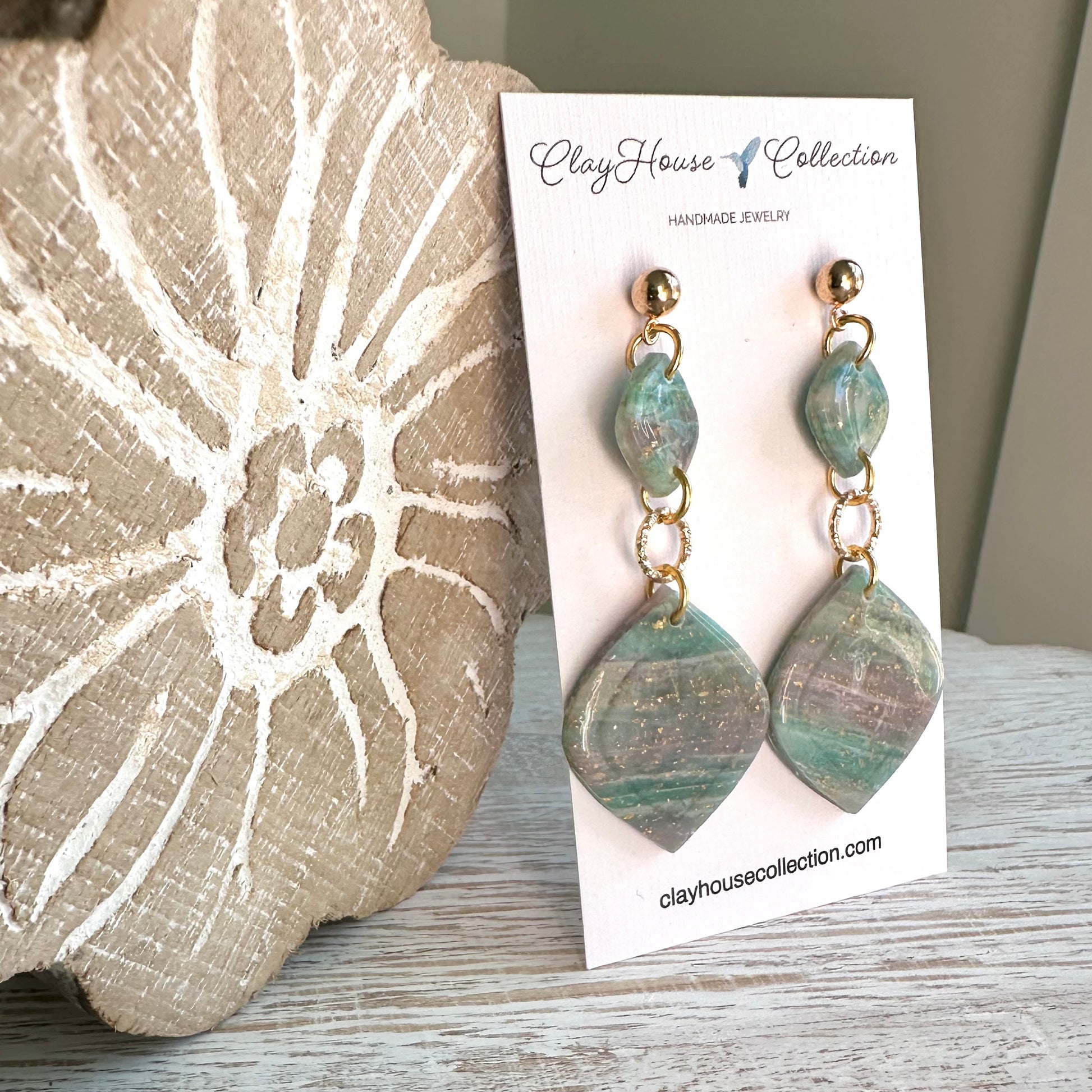 Green marbled clay earrings with flecks of gold leaf foil, featuring gold plated stud posts.