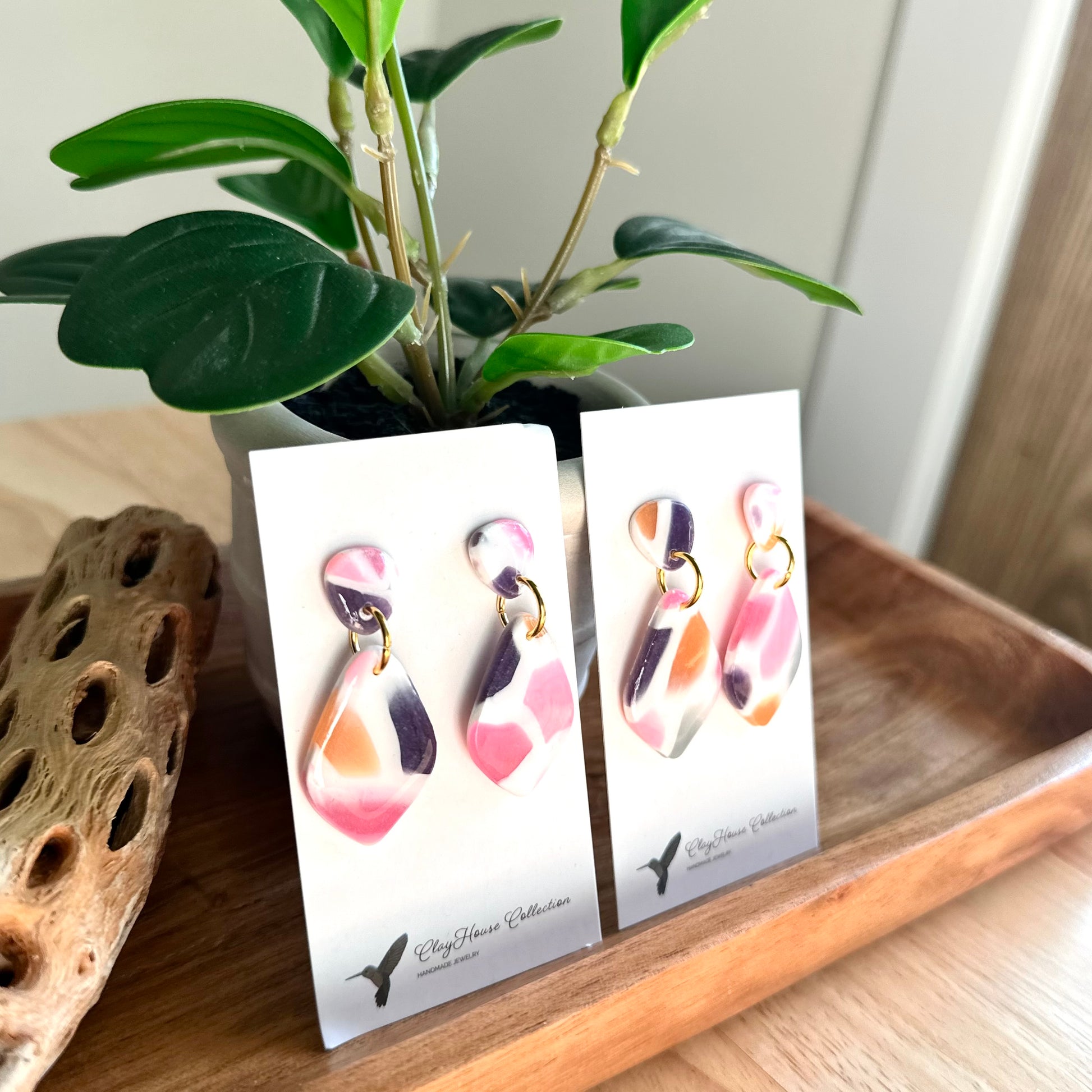 ClayHouse Collection jewelry is handmade from polymer clay. Every pattern is created by hand. Due to the craftsmanship and uniqueness of the process, the resulting pattern on each pair will vary slightly. No two patterned pieces will be identical. Multiple pictures are provided to give a sample of the variations in pattern.