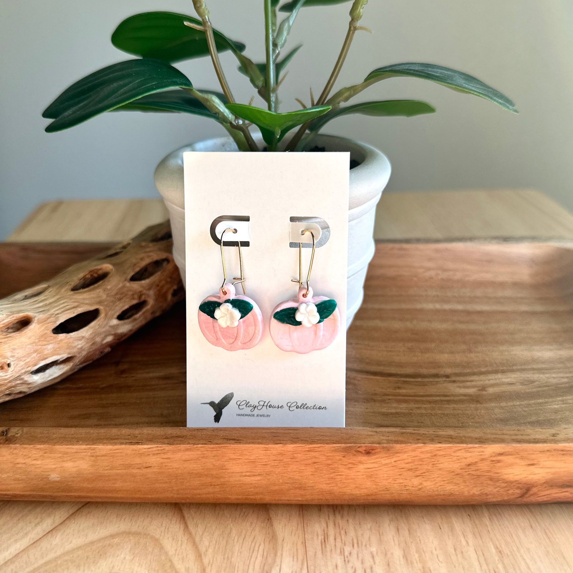 Pink Pumpkin w/ Flower & Leaf Clay Earrings