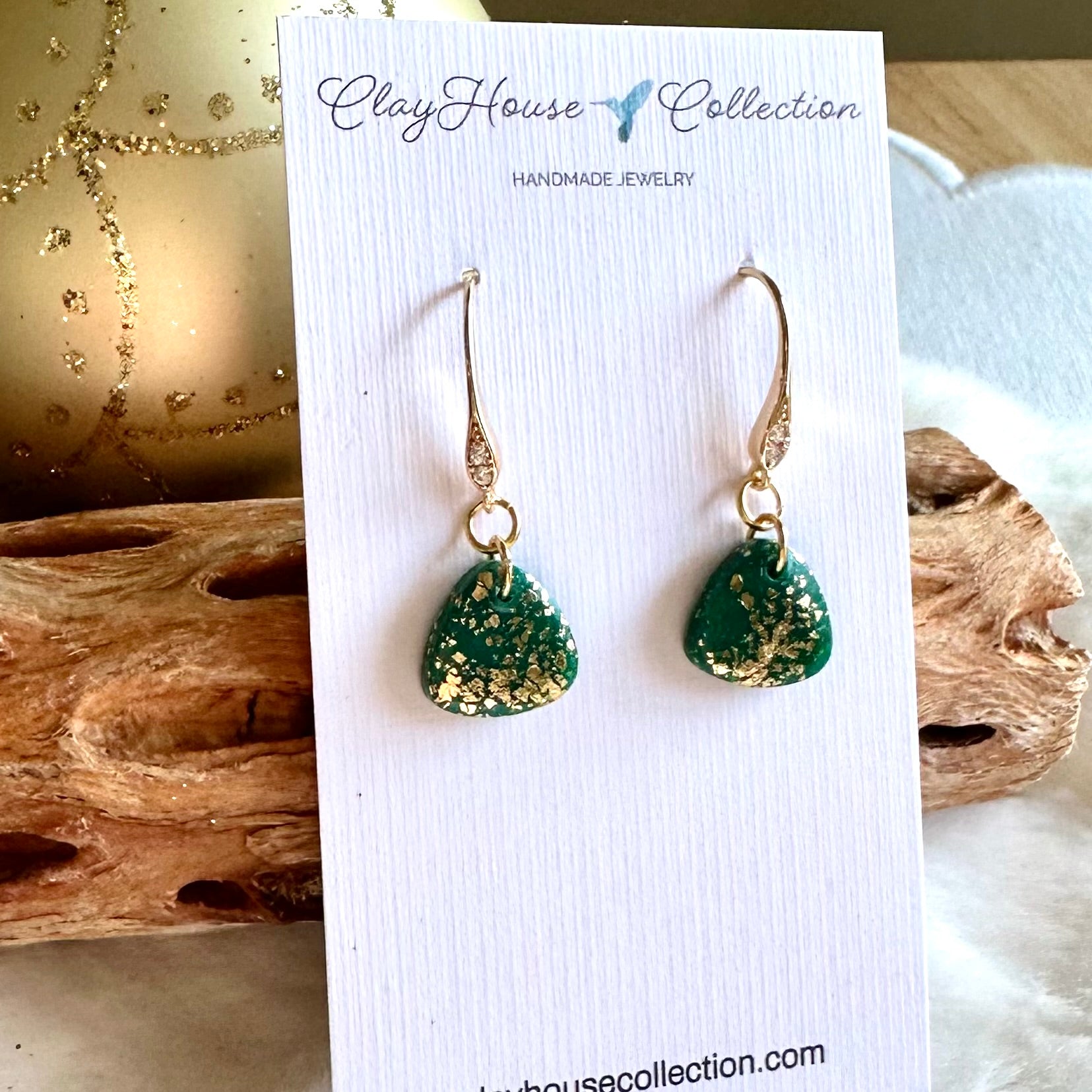 Emerald green small triangle shaped clay earrings with gold leaf foil mixed in. Features an 18k gold plated brass cubic zirconia embellished French ear wire hook.
